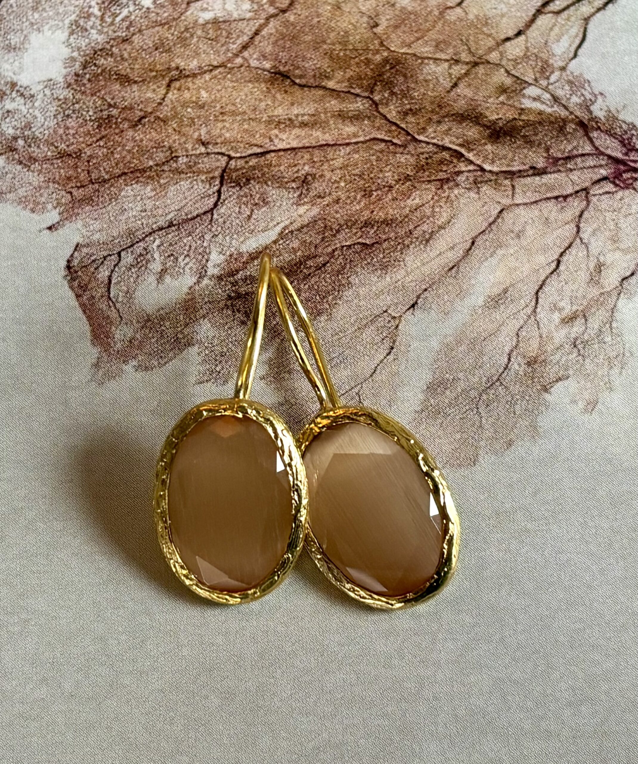 Vergulde oorbel met mooie ovale hanger met beige cateye