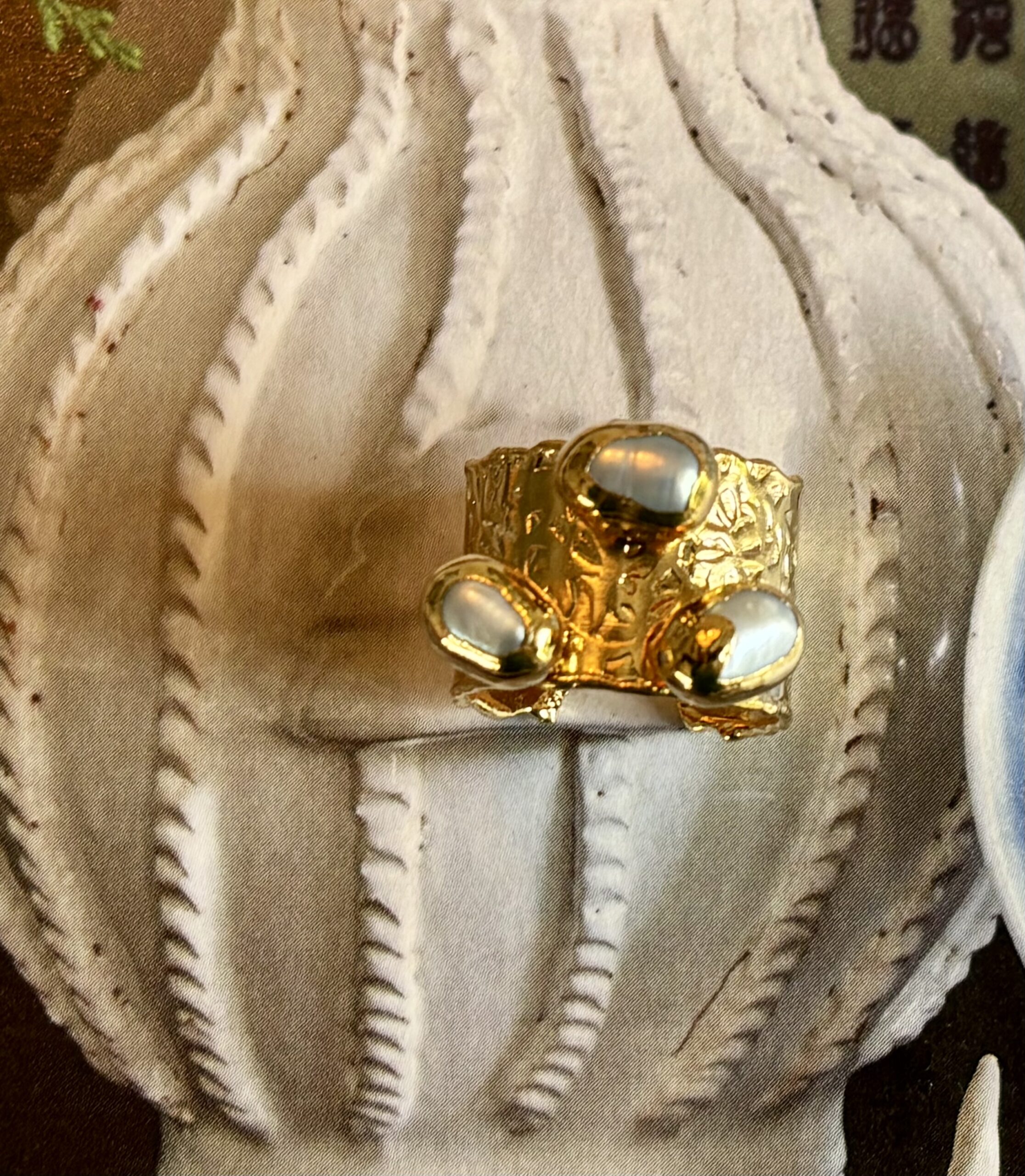 Super leuke ring verguld (basis is koper) met 3 zoetwaterpareltjes. Dikte van de ring is 1,5 cm. Maat is aan te passen. Gratis verzending in Nederland.