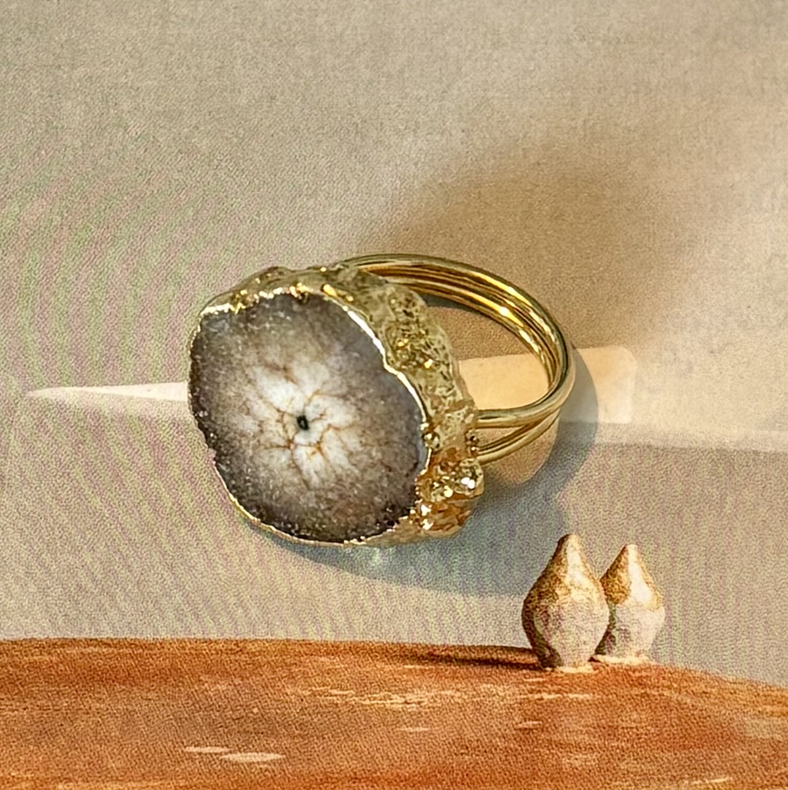 Mooie ring verguld (basis is koper) met grote beige bruine labradoriet steen 2 cm. ( ik twijfel of het toch niet een agaatsteen is maar mijn app van Rock Identifier zegt steeds labradoriet). Maat is aan te passen. Gratis verzending in Nederland.